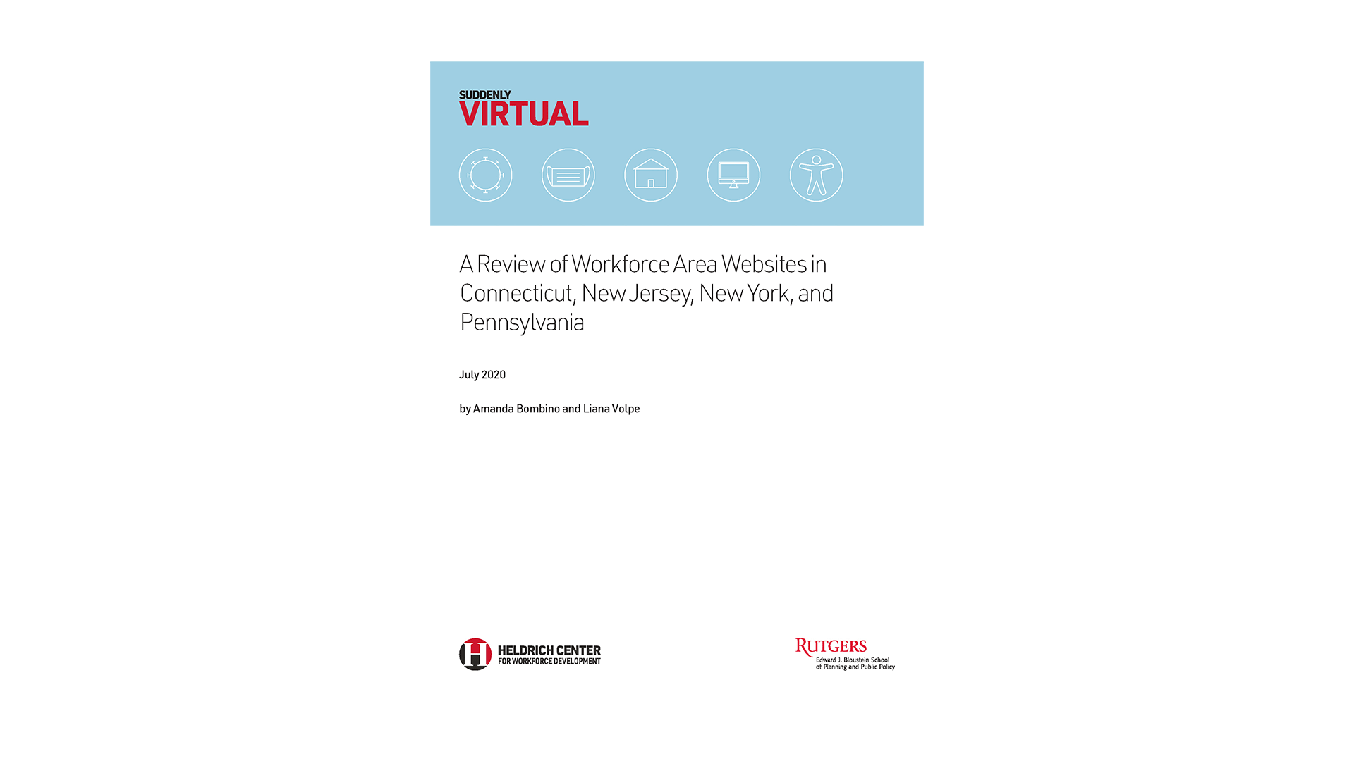 The Heldrich Center launched the Suddenly Virtual series in March 2020 at the start of the global pandemic when public workforce staff were suddenly forced into virtual operations. Suddenly Virtual explored how the public workforce system responded to the pandemic and the need to offer virtual services through remote teams. The series offered technological tools, tips, and strategies that could be employed by the public workforce system to reach virtual customers more efficiently and effectively. Through multi-state surveys, roundtable discussions, and other direct contact with the field, researchers produced issue briefs, blog posts, and toolkits to quickly share what was happening in the field and identify challenges, opportunities, and recommendations for immediate action. Later, the Heldrich Center, launched Strategically Virtual, which built off the lessons learned from Suddenly Virtual to explore how to guide the public workforce system on being more strategically virtual, particularly how that could be operationalized at the state and local levels. Strategically Virtual envisioned how the public workforce system could engage community resources and partners to address job seekers’ needs.